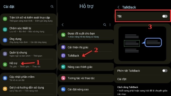 Mở ứng dụng Cài đặt -> Cuộn xuống và tìm Hỗ trợ -> Nhấn vào Talkback -> Gạt công tắc từ Bật sang Tắt để vô hiệu hóa tính năng này.