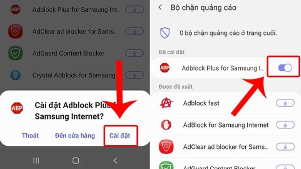 Bước 3: Nhấn chọn Cài đặt để tự động tải và cài đặt bộ chặn quảng cáo sẽ vào điên thoại Samsung. Sau đó người dùng nhấn gạt bật công tắc để kích hoạt chế độ chặn quảng cáo trên trình duyệt Samsung Internet.