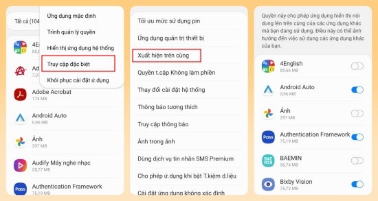 Bước 2: Tại đây, bạn nhấn chọn Truy cập đặc biệt >> chọn Xuất hiện trên cùng và chọn tắt bỏ ứng dụng đi kèm quảng cáo pop-up là xong.