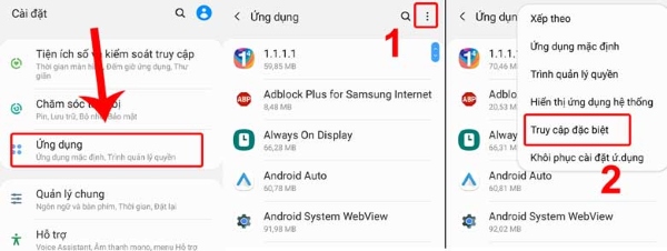 – Mở mục Cài đặt trên điện thoại Samsung >> chọn mục Ứng dụng >> chọn tiếp biểu tượng dấu 3 chấm dọc >> chọn mục Truy cập đặc biệt.