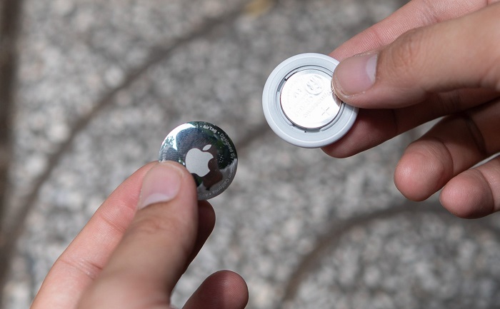 Trong tay người trải nghiệm hiện có hai cái AirTag, một cái người trải nghiệm gắn vào móc chìa khóa xe máy, một chiếc chưa sử dụng gì. Và người trải nghiệm sẽ tiến hành kiểm tra độ bền của chiếc AirTag chưa được dùng.