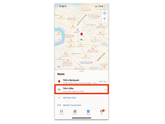 Sau khi xả nước một hồi người trải nghiệm kiểm tra lại khả năng hoạt động của AirTag bằng cách mở Find My trên iPhone ra. Âm thanh và định vị vẫn hoạt động tốt.