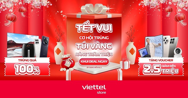 Từ ngày 01/01/2025 đến 14/02/2025, khi mua sắm tại hệ thống Viettel Store hoặc qua website viettelstore.vn/tet2025, bạn sẽ nhận mã dự thưởng tham gia quay số may mắn với cơ hội trúng Túi Vàng trị giá 2.500.000đ.