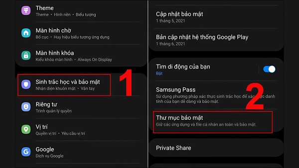 Bước 1: Mở ứng dụng “Cài đặt” trên thiết bị Samsung. Sau đó, tìm đến phần “Sinh trắc học và bảo mật” trong danh sách tùy chọn. Khi vào giao diện này, tiếp tục nhấn chọn “Thư mục bảo mật”.