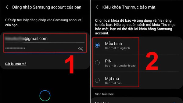 Bước 2: Đăng nhập vào tài khoản Samsung của bạn, sau đó tiến hành thiết lập phương thức bảo vệ cho thư mục. Người dùng có thể lựa chọn một trong ba hình thức bảo mật: vẽ mẫu hình, nhập mã PIN hoặc sử dụng mật khẩu. Sau khi hoàn tất, thư mục bảo mật sẽ được kích hoạt và sẵn sàng sử dụng trên thiết bị của bạn.