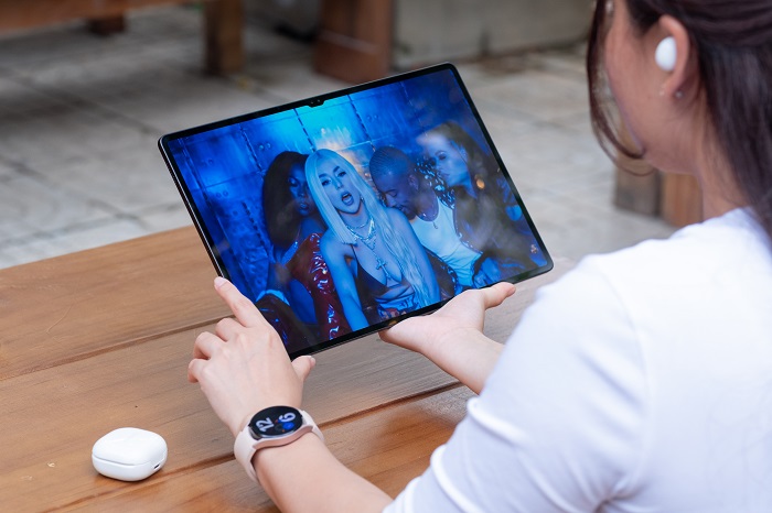 Đâu chỉ nghe nhạc hay, thất tình thì buồn vậy đó mà nghe tin series phim yêu thích ra tập mới thì cũng phải tranh thủ cày liền chớ. Mở chiếc Galaxy Tab S8 Ultra màn hình lớn 14.6 inch, vào ngay Netflix và kết hợp thêm với tai nghe Galaxy Buds2 cùng chất âm chuẩn studio để đưa bạn đắm mình vào những thước phim, có mấy anh “chồng quốc dân” trong phim rồi thì crush cũng cho ra chuồng gà luôn keke.