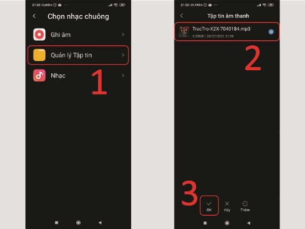 Bước 4: Nhấn chọn vào Quản lý tập tin >> chọn bài hát đã tải từ NhacCuaTui để làm nhạc chuông là xong.