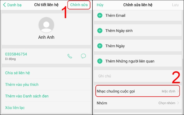 Bước 2: Tại giao diện thông tin chi tiết về người liên hệ, bạn chọn phần Chỉnh sửa ở góc phải và chọn Nhạc chuông cuộc gọi.