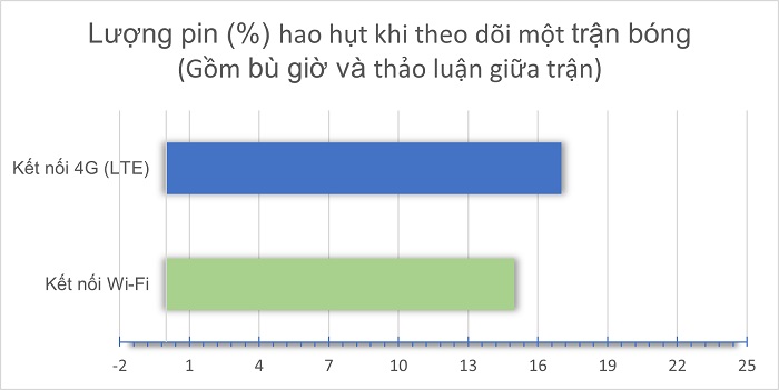 Nhờ sở hữu thỏi pin có dung lượng lên tới 5,000 mAh và bộ xử lý tối ưu hóa tốt về khả năng tiêu thụ năng lượng mà Galaxy A53 5G sẽ mang đến cho người dùng thời lượng sử dụng pin tuyệt vời. Trải nghiệm thực tế cho thấy Galaxy A53 5G chỉ mất khoảng 15% pin cho một trận bóng đá diễn ra 90 phút, bao gồm cả bù giờ và thời gian thảo luận giữa giờ của các BLV. Và đó là mức pin bị tiêu tốn khi bạn sử dụng Wi-Fi, còn nếu 4G thì điện thoại mất khoảng 17-18% pin, quá ấn tượng phải không nào?