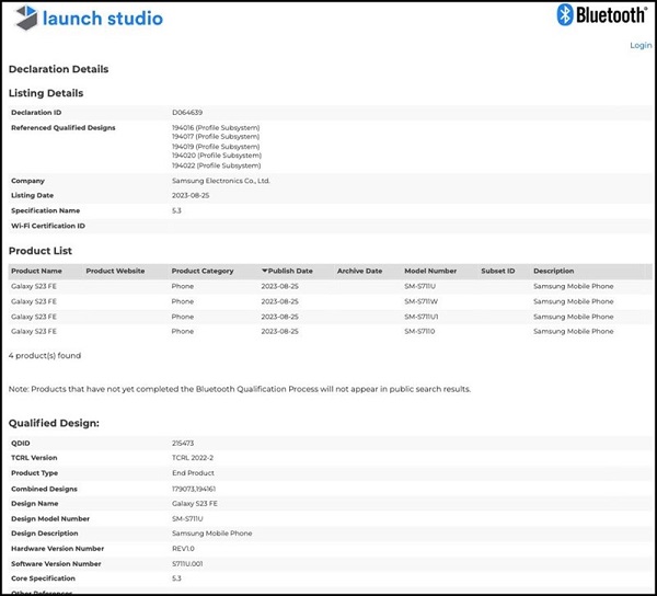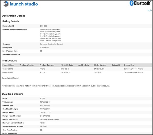 Bên cạnh đó, Galaxy S23 FE còn được phát hiện trên cơ sở dữ liệu của chứng nhận Bluetooth SIG thông qua các mã số bị rò rỉ gồm SM-S711U, SM-S711W, SM-S711U1, SM-S7110, SM-S711B DS và SM-S711B. Trong đó, còn có một vài biến thể khác xuất hiện trên cơ sở dữ liệu của cơ quan Wireless Power Consortium.