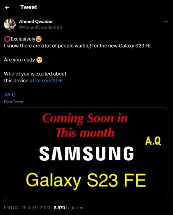 Đặc biệt thời gian ra mắt Galaxy S23 FE đã bất ngờ được tiết lộ qua một bài viết của leaker Ahmed Qwaider trên mạng xã hội Twitter. Cụ thể, máy sẽ được trình làng trong tháng 6 này.