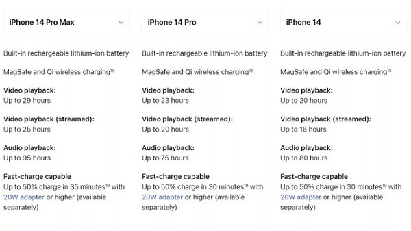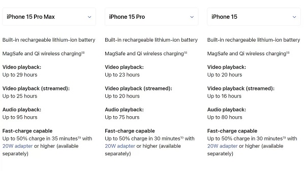 Theo đó, Apple không cho biết dung lượng pin cụ thể của dòng iPhone thế hệ mới, tuy nhiên theo số liệu được công bố bởi hãng thì thời lượng pin trên iPhone 15 Series, bao gồm cả phiên bản tiêu chuẩn và phiên bản Pro sẽ không có bất kỳ sự thay đổi nào so với thế hệ cũ trước đó. Điều này có thể khiến người dùng cảm thấy hụt hẫng dù được trang bị khá nhiều nâng cấp đáng chú ý. Bên cạnh đó, dòng iPhone 15 Series cũng chỉ được hỗ trợ sạc nhanh có dây 20W tương tự như dòng iPhone 14 Series.