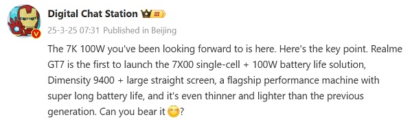 Các mẫu iQOO Neo 9S, redmi K80 Ultra, OnePlus Ace 5S, và realme GT 7 đều được dự kiến sẽ sử dụng chipset Dimensity 9400+. Theo thông tin rò rỉ từ Digital Chat Station, realme đang nỗ lực để trở thành thương hiệu đầu tiên ra mắt smartphone với con chip này. Vì vậy, realme GT 7 có thể sẽ được trình làng sớm nhất vào tháng 4.