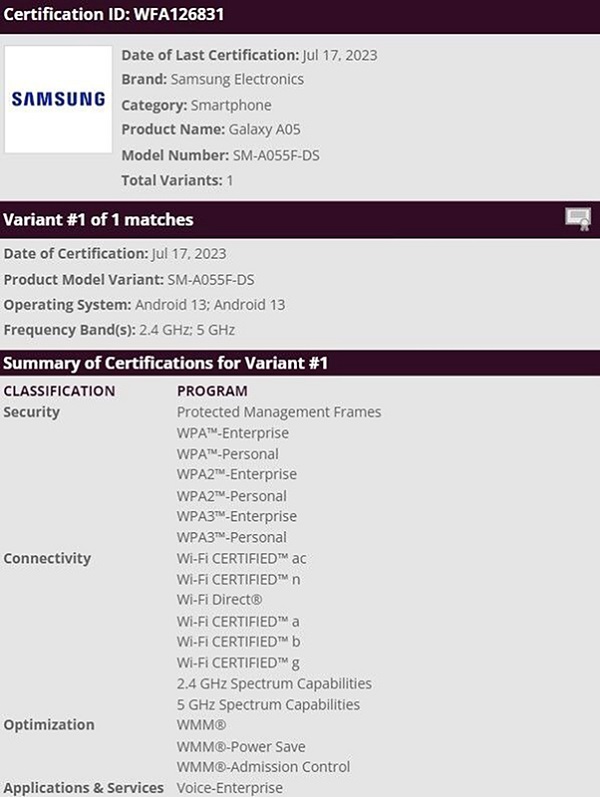 Từ chứng nhận wifi trên có thể thấy, Galaxy A05 mang mã số model là SM-A055F-DS và được cài đặt sẵn hệ điều hành Android 13. Ngoài ra, máy còn được trang bị Wi-Fi 2.4GHz và 5GHz.