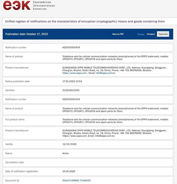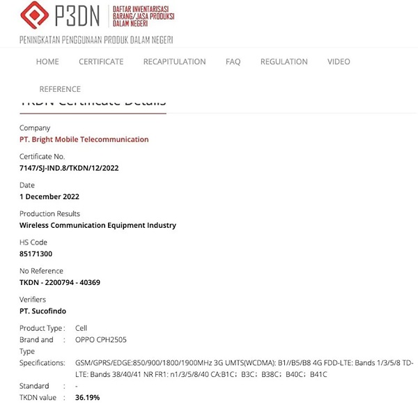 Thông tin về OPPO Reno8 T 5G mới nhất chúng tôi nhận được là mẫu điện thoại này có mã model là CPH2505 và đã đạt được các chứng nhận từ tổ chức: BIS của Ấn Độ, IMDA của Singapore, TKDN của Indonesia và EEC của Châu Âu.