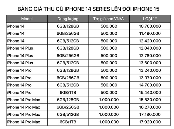 2. Bảng giá thu cũ iPhone 14 Series lên đời iPhone 15
