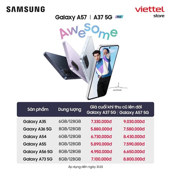 Viettel Store mang đến cơ hội “lên đời” Galaxy A37 và A57 5G cực kỳ hấp dẫn với chương trình “Thu cũ giá cao”. Khách hàng sẽ được trợ giá lên đến 50%, giúp việc nâng cấp smartphone trở nên dễ dàng và tiết kiệm hơn bao giờ hết.