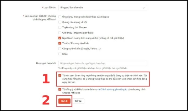 Bước 3: Tiếp tục điền đầy đủ các thông tin theo yêu cầu của Shopee. Lưu ý, người dùng phải chọn chính xác link mạng xã hội sẽ làm Affiliate Shopee, nếu chọn sai bạn sẽ không thể làm tiếp thị liên kết trên các kênh đó.