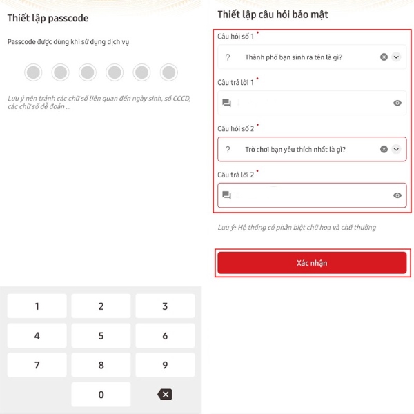 Bước 8: Tiếp đó, bạn hãy đăng nhập vào ứng dụng lại lần nữa và tiến hành thiết lập mật khẩu > sau khi hoàn thành mật khẩu bạn sẽ hãy thiết lập câu hỏi bảo mật bằng cách lần lượt chọn và trả lời câu hỏi 1,2 > nhấn Xác nhận.