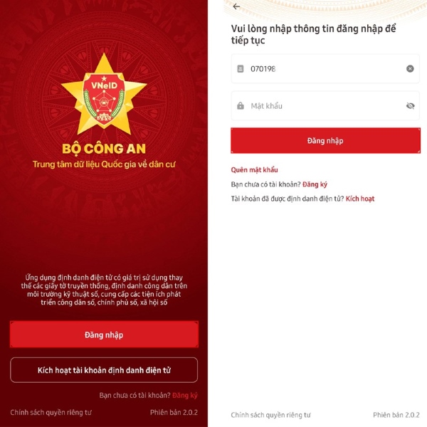 Bước 2: Tiến hành các bước đăng ký tài khoản định danh. Bạn hãy mở lại ứng dụng chọn Đăng nhập điền thông tin của mình vào đây.