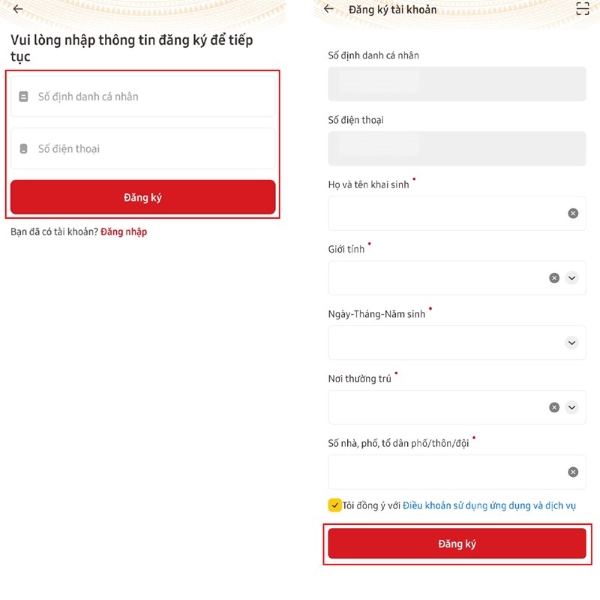 Bước 3: Nhập Số định danh cá nhân (số trên CCCD gắn chip của bạn) và Số điện thoại của bạn, nhấn Đăng ký > điền đầy đủ thông tin của bạn vào > chọn Đăng ký.