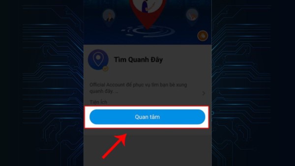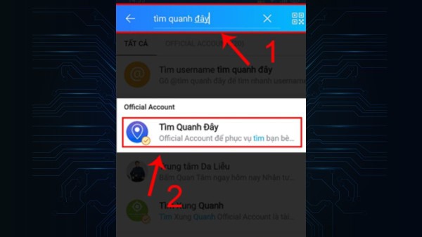 Bước 2: Sử dụng thanh tìm kiếm để nhập từ khóa Tìm quanh đây, sau đó chọn tài khoản chính thức Tìm Quanh Đây Zalo.