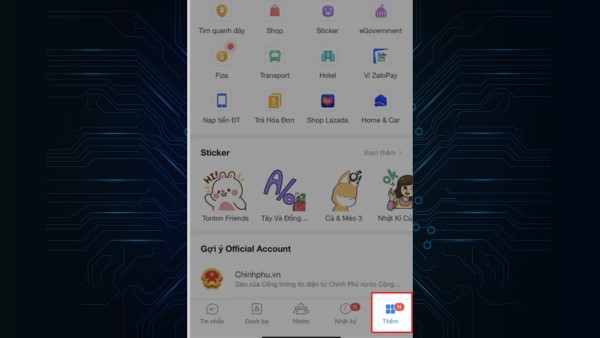 Bước 1: Truy cập ứng dụng Zalo và bấm vào nút Thêm ở góc dưới bên phải màn hình.