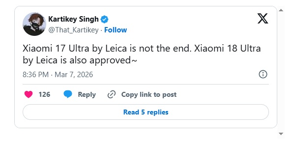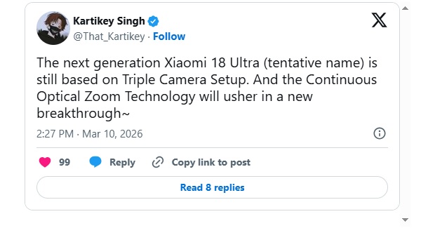 Hiện tại, các mẫu Xiaomi 17, Xiaomi 17 Ultra và phiên bản Leitzphone do Xiaomi hợp tác cùng Leica đã được mở bán tại nhiều thị trường. Theo các thông tin rò rỉ, thế hệ kế nhiệm của chúng có thể xuất hiện vào nửa đầu năm 2027. Điểm đáng chú ý trong tin đồn về Xiaomi 18 Ultra lần này là khả năng hãng sẽ cải tiến đáng kể công nghệ zoom quang học trên hệ thống camera của các flagship mới.