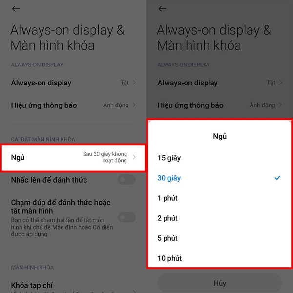 Vào ứng dụng “Cài đặt” -> chọn “Always-on display & Màn hình khóa” -> chọn mục “Ngủ” và lựa chọn thời gian để màn hình tắt mà bạn muốn.