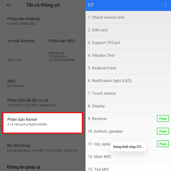 Bước 2. Nhấn vào mục “Phiên bản Kernel” khoảng 5 lần để chạy CIT. Ngay sau đó toàn bộ phần cứng của máy sẽ được hiển thị lên màn hình và bạn có thể xem nó.