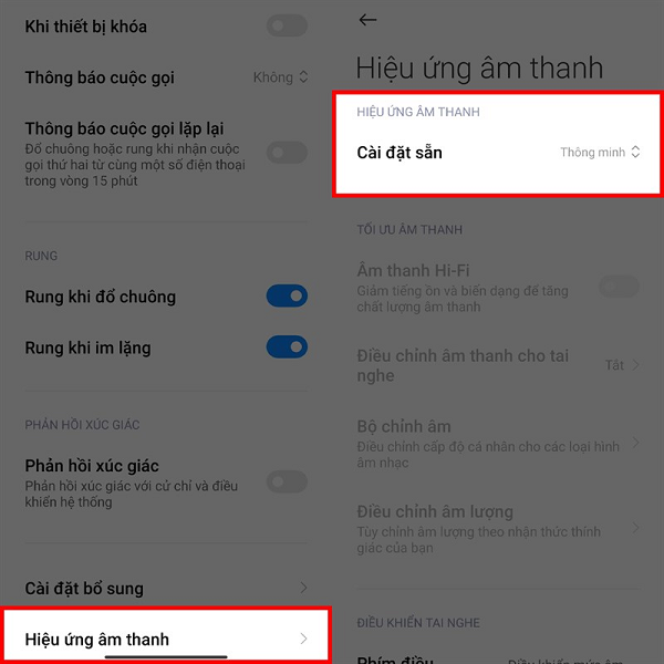 Tính năng ẩn trên điện thoại Xiaomi tiếp theo là chọn hiệu ứng âm thanh theo sở thích. Tính năng này sẽ đem đến những trải nghiệm thú vị hơn cho người dùng. Cách thực hiện như sau: Vào ứng dụng “Cài đặt” -> chọn “Âm thanh và rung” -> chọn mục “Hiệu ứng âm thanh” -> chọn “Cài đặt sẵn” và chọn cho mình hiệu ứng mà mình thấy thích nhất.