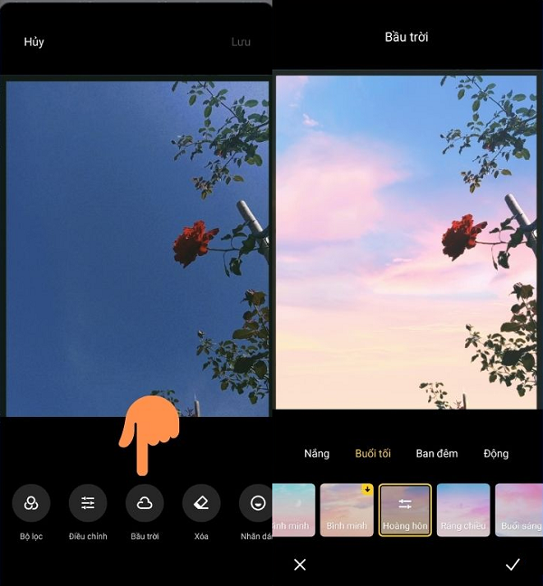 Cách thực hiện như sau: Vào thư viện ảnh -> chọn bức ảnh mà bạn muốn xóa đi chi tiết thừa -> chọn vào biểu tượng chỉnh sửa -> chọn vào biểu tượng hình đám mây và cuối cùng chọn bộ lọc mà bạn thấy thích nhất. Cuối cùng chọn vào dấu tích để hoàn thành và lưu ảnh.