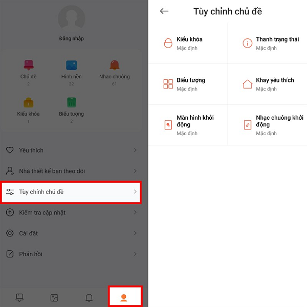 Bước 1: Bạn mở icon “Chủ đề” lên -> tìm và chọn vào “Biểu tượng cá nhân” góc phải bên dưới màn hình -> chọn vào “Tùy chỉnh chủ đề” và sau đó chọn từng mục để tiến hành tùy chỉnh chủ để theo sở thích.