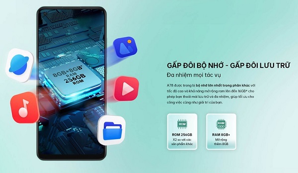 Không chỉ vậy, OPPO A78 còn đi kèm với RAM lớn 8GB và được hỗ trợ công nghệ RAM ảo 8GB, nâng tổng dung lượng RAM lên tới 16GB, cho phép bạn đa nhiệm thoải mái nhiều ứng dụng cùng lúc mà không phải lo xảy ra tình trạng giật lag. Chưa kể bộ nhớ trong 256GB lớn còn mang đến cho bạn một không gian rộng lớn để lưu trữ mọi dữ liệu cần thiết của mình. Có thể nói, đây là một trong những điểm nhấn nổi bật của OPPO A78 so với các đối thủ cùng tầm giá.