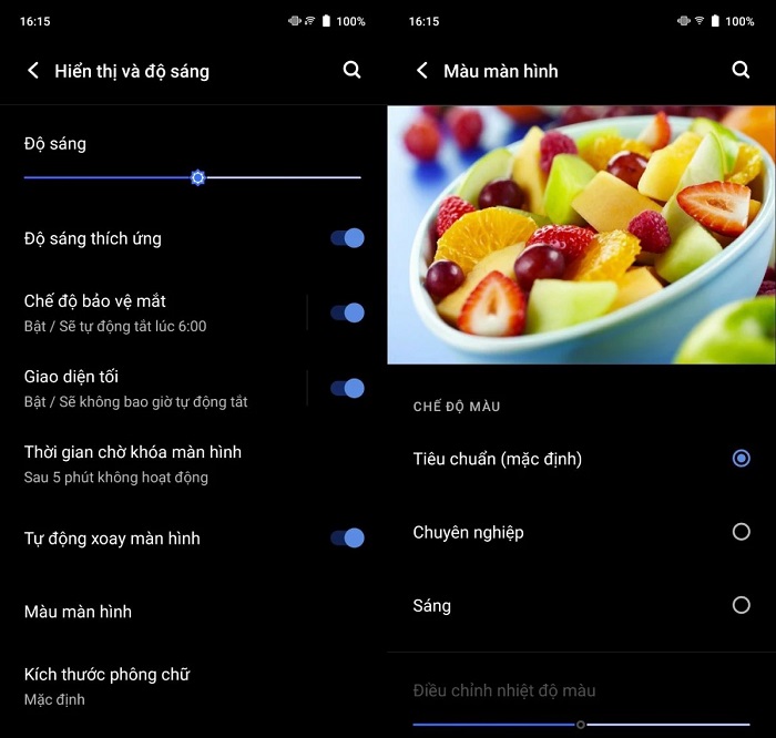 bật “Chế độ bảo vệ mắt” lên. Tiếp tục vào “Màu màn hình” và chọn chế độ màu phù hợp với sở thích của mình. Bên cạnh đó bạn cũng có thể điều chỉnh nhiệt độ màu.