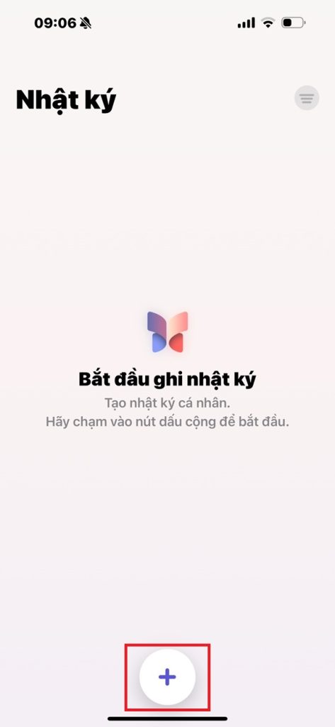 Trước tiên, bạn hãy mở ứng dụng Nhật Ký trên chiếc iPhone của mình. Tại giao diện chính, bạn hãy nhấn nút vào biểu tượng dấu (+).