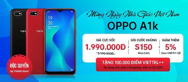 Nhân ngày Nhà giáo Việt Nam 20/11, Viettel Store triển khai chương trình mua OPPO A1k giá sốc chỉ 1.990.000 đồng áp dụng với các khách hàng là giáo viên hòa mạng mới, hoặc chuyển từ trả trước sang trả sau có mức sử dụng 3 tháng liền kề trung bình < 150.000 đồng.
