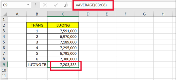 Ví dụ: Tính bạn muốn tính lượng trung bình theo thông tin dưới đây với công thức =AVERAGE(C3:C8) sẽ nhận được kết quả là giá trị trung bình 6 tháng lương.