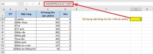 Ví dụ: Bạn có bảng thống kê các mặt hàng và có số lượng tồn. Bạn muốn thống kê xem có bao nhiêu mặt hàng còn tồn trong số 150 sản phẩm, thì cần nhập công thức như sau: =COUNTIF(C2:C11,”>150″). Sau đó, kết quả trả về sẽ là tổng cộng 8 mặt hàng tồn trên 150 sản phẩm.