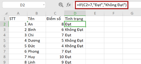 Tại ô D2, công thức sẽ là =IF(C2>=7,”Đạt”,”Không Đạt”), và được kết quả bạn nhận được như sau: