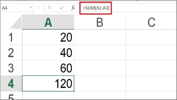 Ví dụ: Tính tổng những dãy số từ A1 đến A3 có cú pháp là =SUM(A1:A3) cho kết quả là 120.