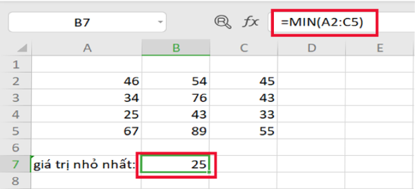 Ví dụ: Giá trị nhỏ nhất trong vùng dữ liệu với công thức =MIN(A2:C5) sẽ nhận được kết quả 25 là giá trị nhỏ nhất cần phải tìm.
