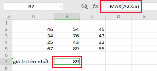 Ví dụ: Tìm giá trị lớn nhất trong vùng dữ liệu với công thức =MAX(A2:C5) sẽ có kết quả là 89 là giá trị lớn nhất cần tìm kiếm.