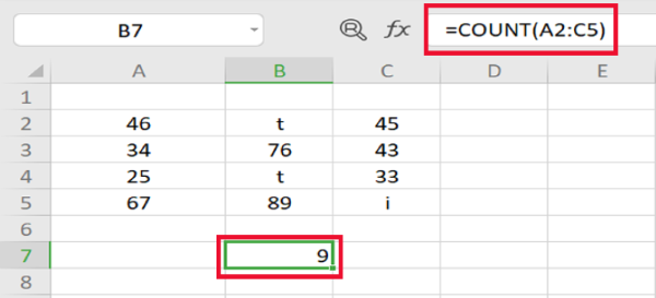 Ví dụ: Bạn muốn tìm số lượng mà giá trị trong ô thuộc vùng dữ liệu là số, sẽ có công thức là =COUNT(A2:C5). Kết quả trả về sẽ là tổng số lượng ô có chứa số được chọn.