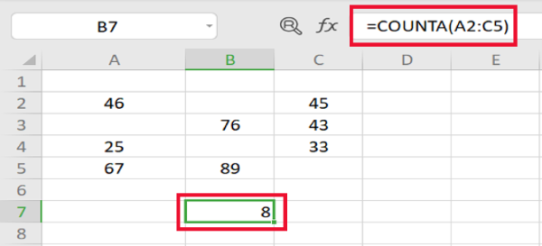 Ví dụ: Bạn muốn đếm số lượng ký tự là số trong bảng Excel sẽ có công thức là =COUNTA(A2:C5). Kết quả nhận được là số lượng ô có chứa kí tự hoặc số trong bảng hoặc vùng được chọn.