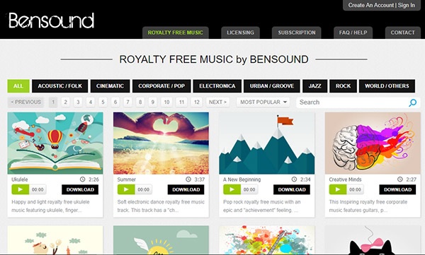 Bensound là 1 kho nhạc cung cấp cho người dùng nhiều bản nhạc miễn phí chất lượng cao và được đánh giá là khá dễ sử dụng.Tuy nhiên, Bensound chỉ có thể lọc theo thể loại và không được đa dạng như Youtube, Facebook.