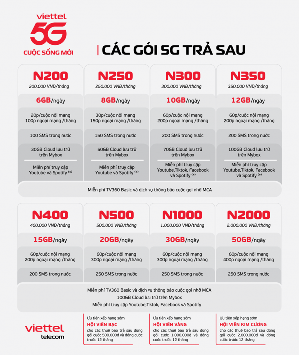 Nhằm giúp người dùng có được trải nghiệm 5G tốt nhất, Viettel mang đến 11 gói cước trả trước và 8 gói cước trả sau dành cho 5G. Giá gói cước 5G thấp nhất chỉ từ 135.000 đồng/tháng.