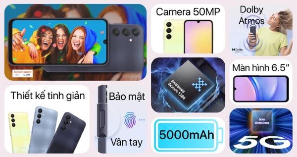 Samsung Galaxy A15 ra mắt vào tháng 12/2023, tiếp tục truyền thống thiết kế đơn giản và trẻ trung của dòng Galaxy A với mặt lưng có phối màu ấn tượng. Màn hình Super AMOLED 6.5 inch của thiết bị này hiển thị hình ảnh sống động và chân thực. Bên cạnh đó, tính năng Eye Comfort Shield còn giúp bảo vệ mắt người dùng khi sử dụng trong môi trường ánh sáng yếu.