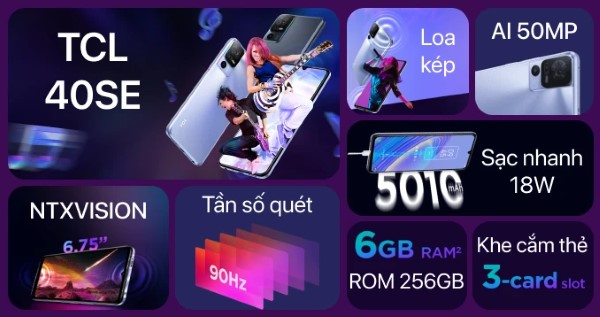 TCL 40SE nổi bật với RAM 6GB và ROM 256GB, cấu hình cực kỳ ấn tượng trong tầm giá. Điều này giúp máy chạy đa nhiệm tốt và lưu trữ thoải mái. Màn hình lớn 6.75 inch và cụm camera đa năng 50MP cũng là điểm cộng đáng giá cho người dùng thích chơi game và chụp ảnh.