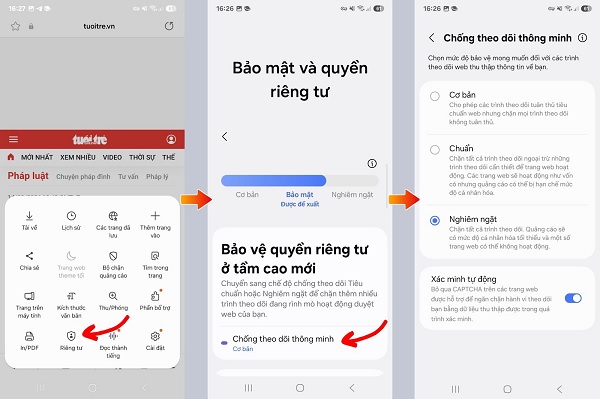 Kích hoạt tính năng này rất đơn giản: bạn chỉ cần truy cập vào Samsung Internet, mở menu tùy chọn bằng cách bấm vào biểu tượng 3 gạch ngang ở góc dưới bên phải màn hình, chọn Riêng tư, sau đó bấm vào Chống theo dõi thông minh (Smart Anti-Tracking) và chọn chế độ phù hợp với nhu cầu sử dụng của bạn.